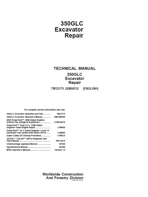 John Deere 350GLC Excavator Repair Technical Manual