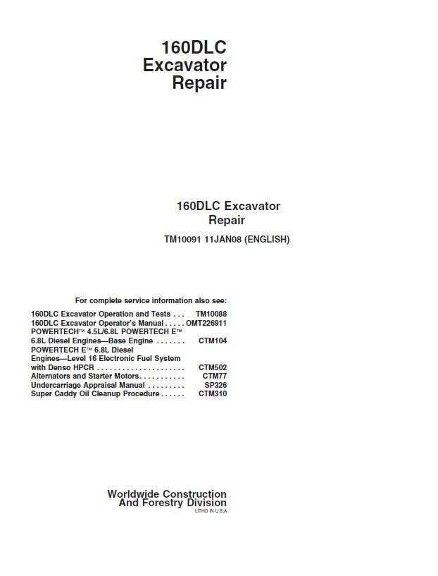 This Deere 160DLC Excavator service manual provides data, attributes, guidelines, and also techniques to do repair work interventions on the car as well as its elements.