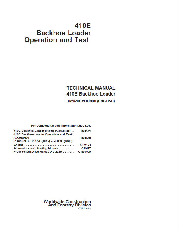 Get the John Deere 410E Backhoe Loader Technical Manual TM1610 procedures and technical diagrams. This resource helps technicians perform maintenance and troubleshooting with confidence. Includes detailed instructions for all major components. Perfect for workshop and field use. Download today and gain access to professional service information that improves repair accuracy and reduces downtime.